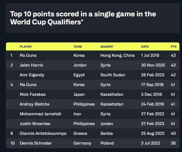 凭借单场42分的表现,27岁的哈里斯成为了2017年实行新的预选赛赛制以来世界杯预选赛单场得分第二高的球员,距离第一名罗健儿在2018年韩国对阵中国香港队时创造的43分历史纪录仅差1分。这也是迄今为止2027年世界杯预选赛的最高单场得分。此外,这也是世界杯预选赛历史上第九次出现单场40分以上的比赛。