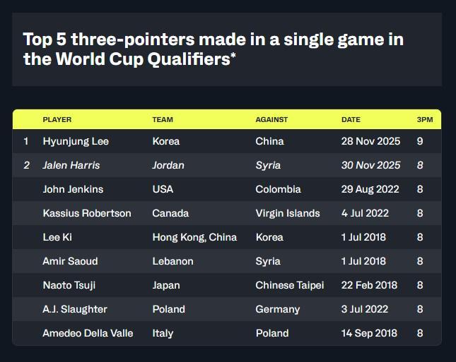 同时,哈里斯单场命中8记三分排名历史第二,仅次于前不久李贤重对阵中国男篮投进的9记三分。