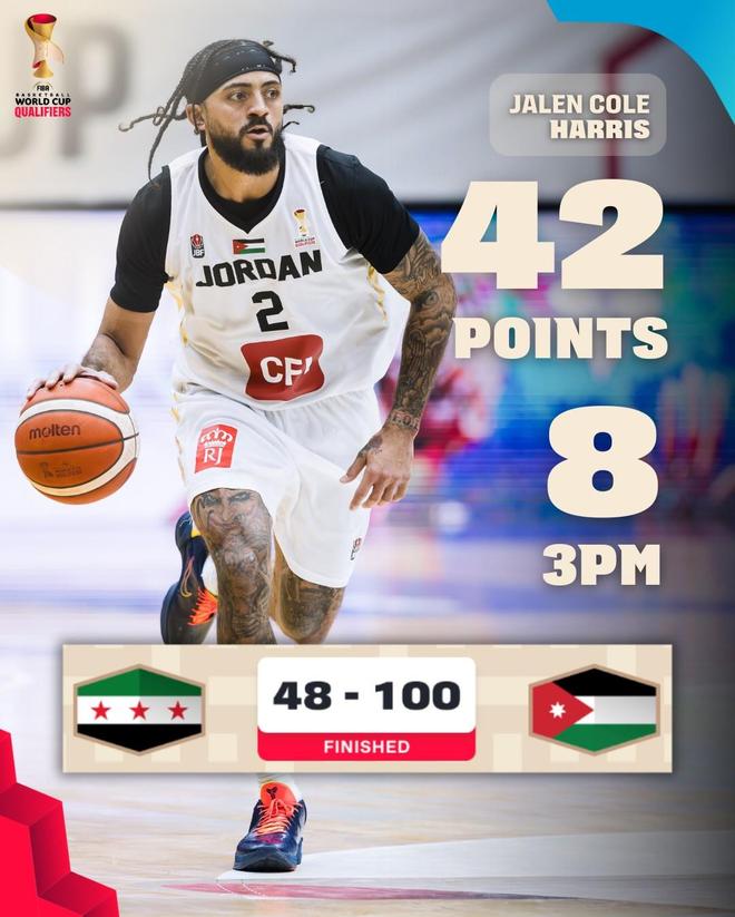 本场比赛,上赛季效力于同曦男篮的后卫外援杰伦-哈里斯作为约旦男篮的归化球员出场,他比赛出场29分钟,24投13中砍下了42分6篮板2助攻1抢断,三分球16投8中,罚球9中8,没有出现失误,出现1次犯规。